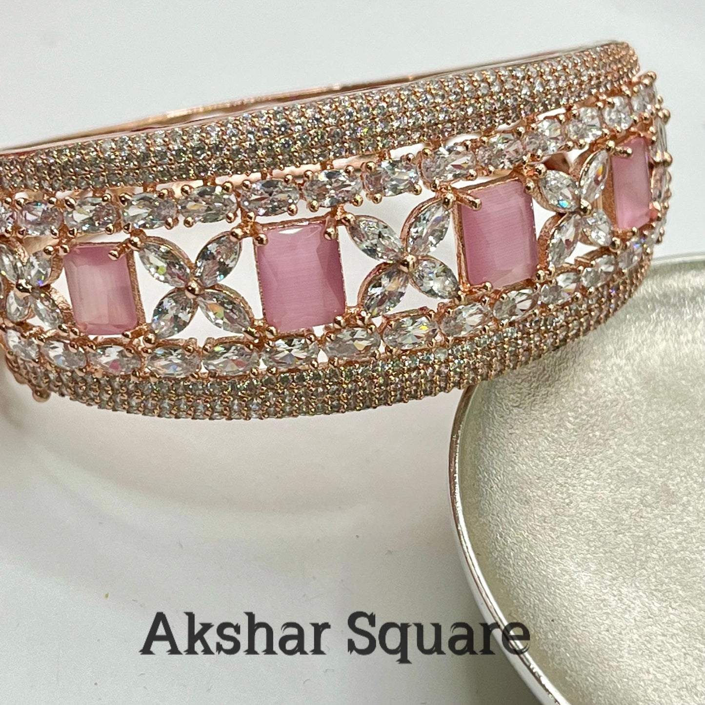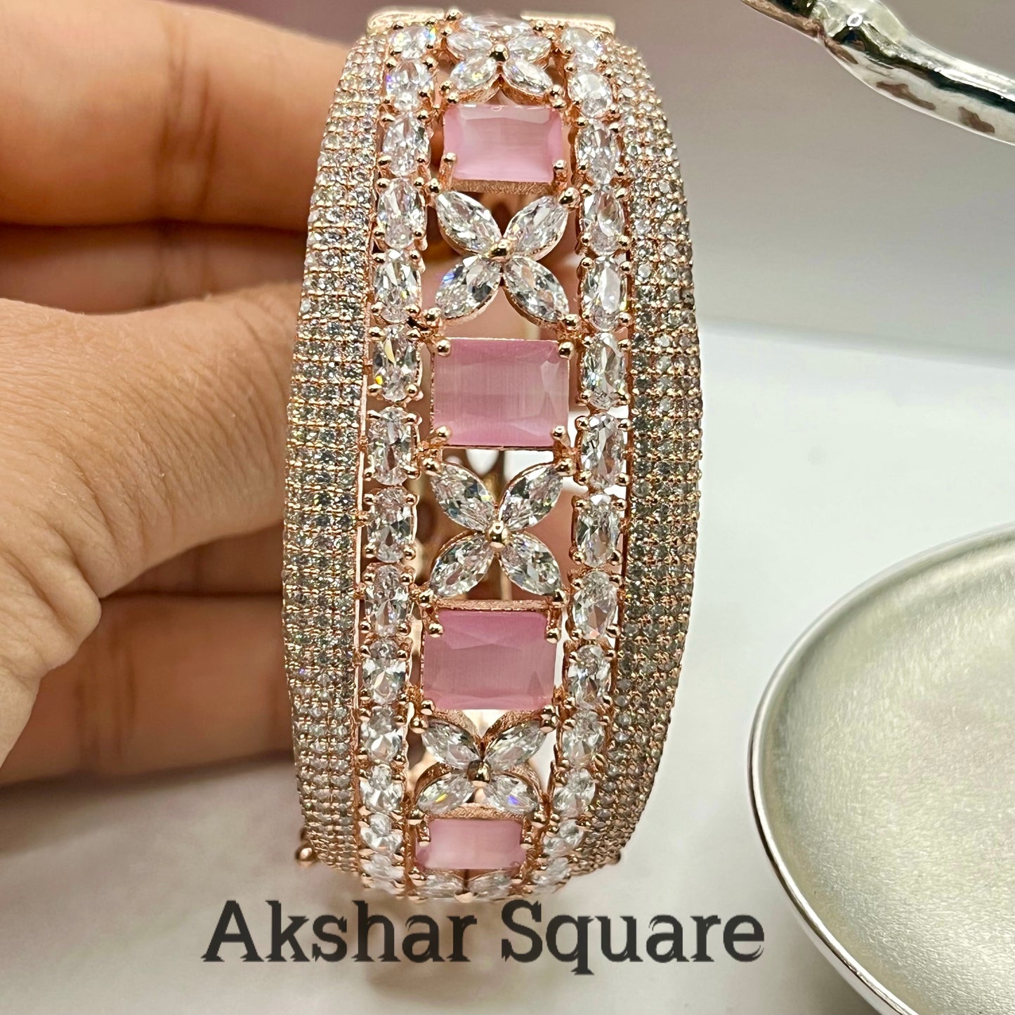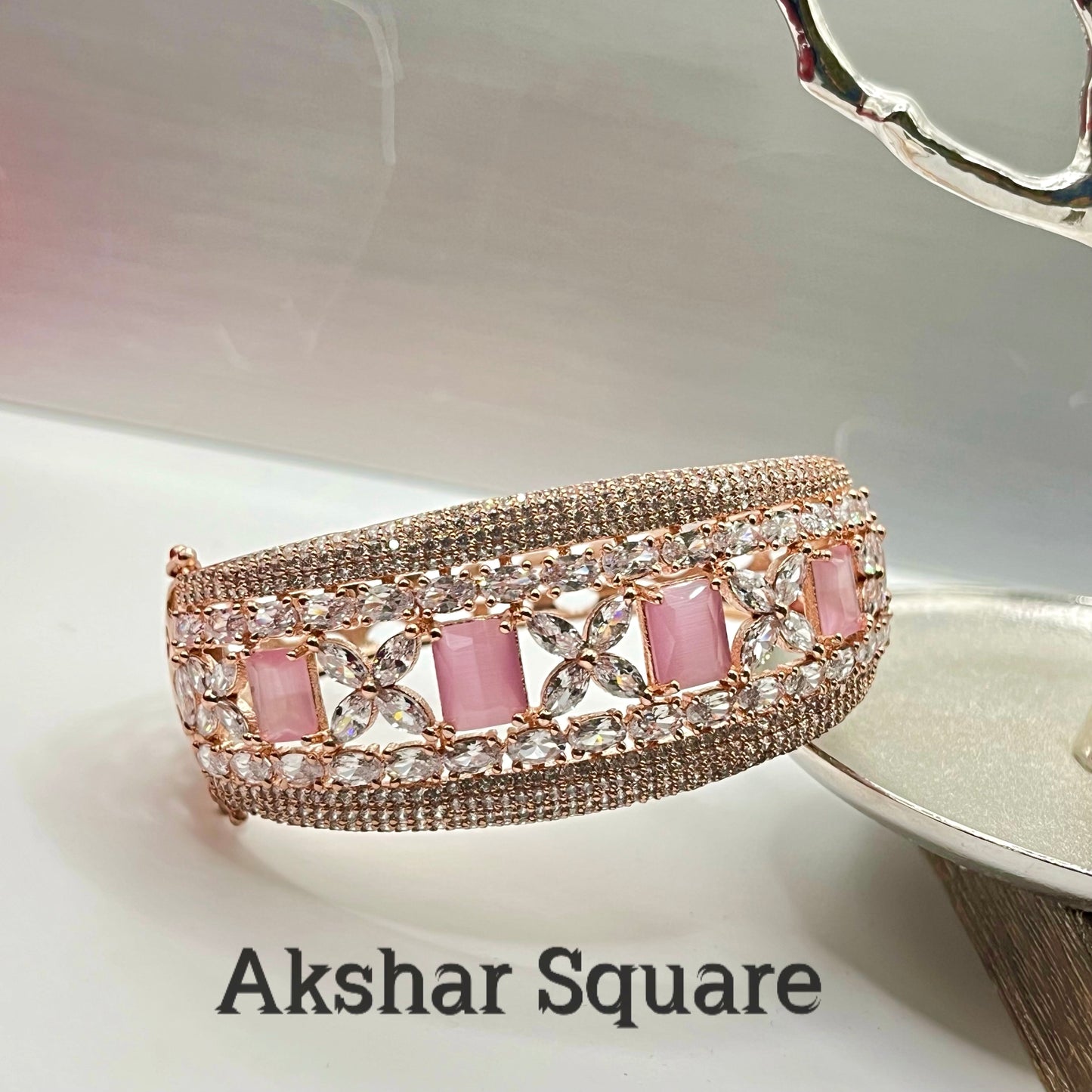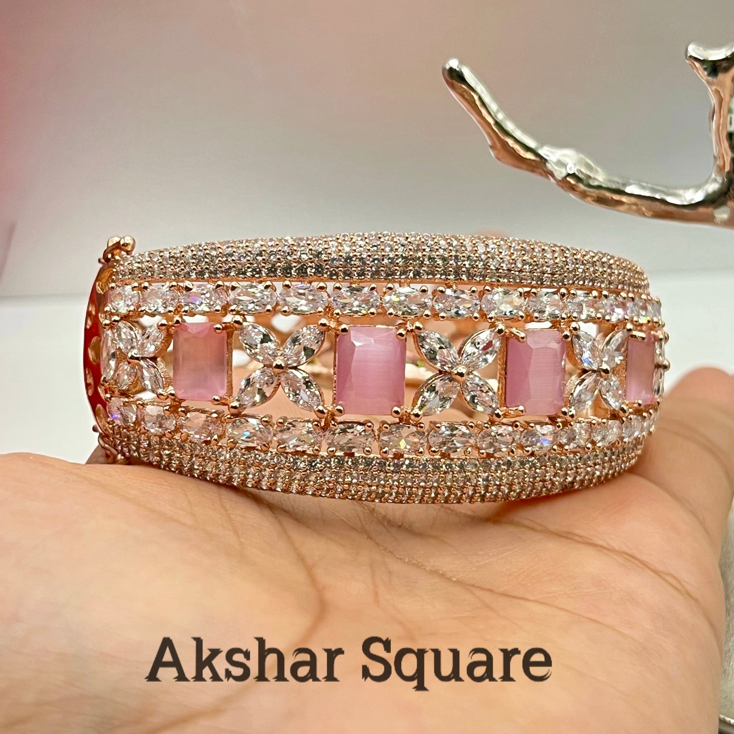 Rose gold finish cubic zirconia(CZ) stones wide bracelet with rectangle shaped color stone in the middle.