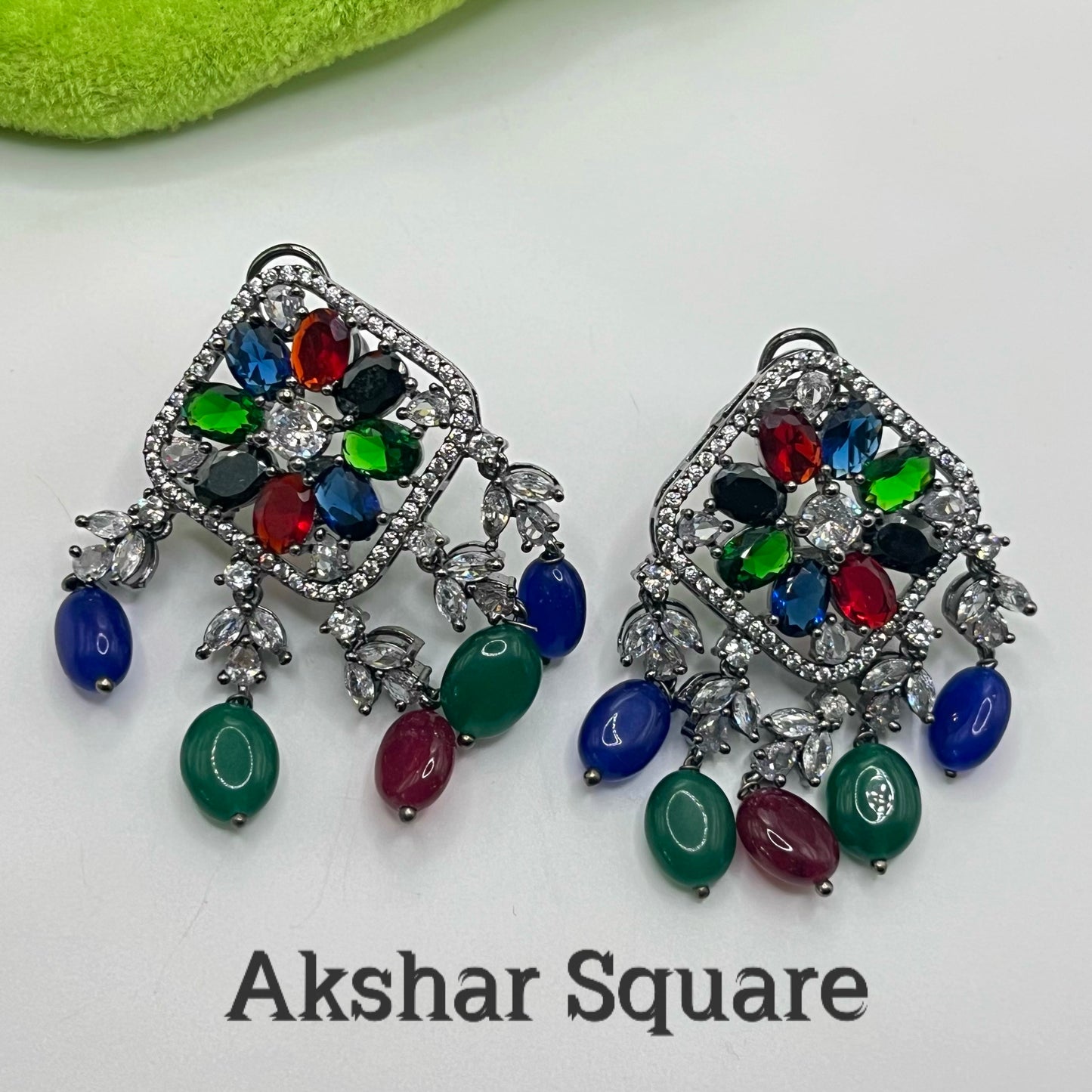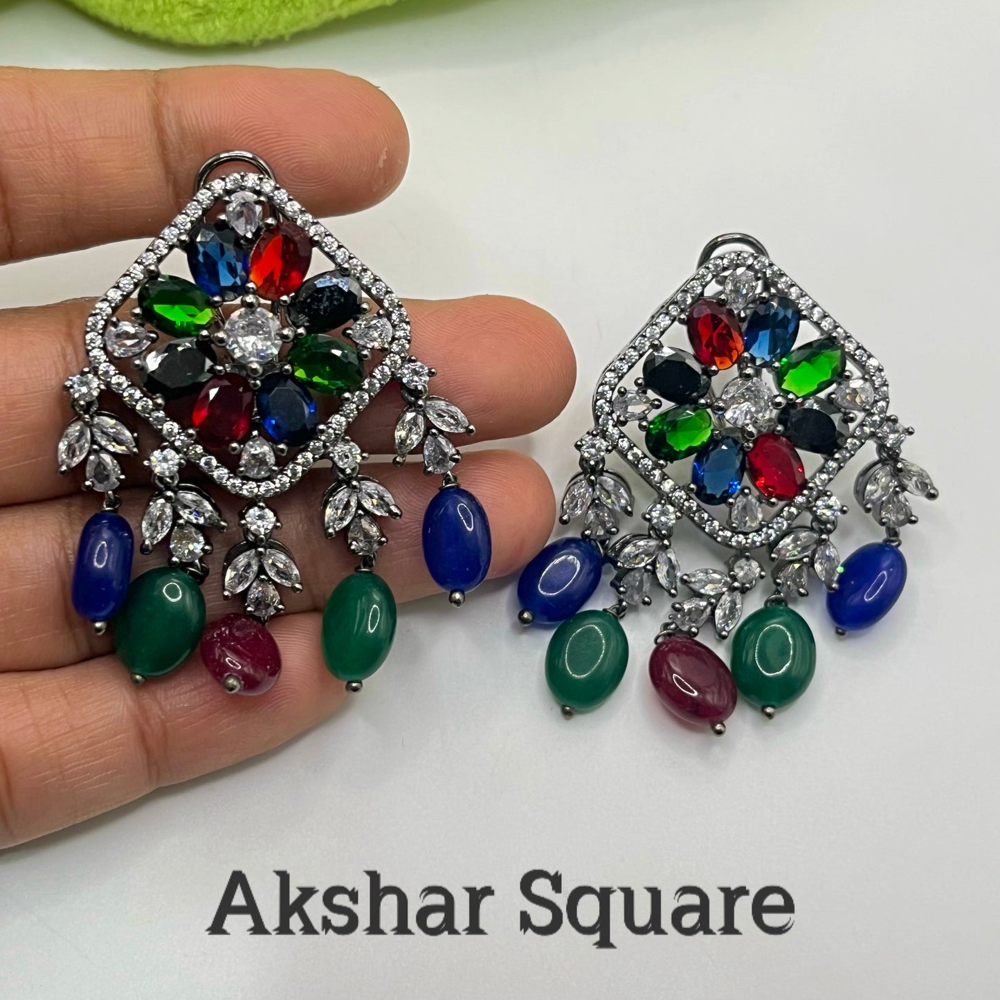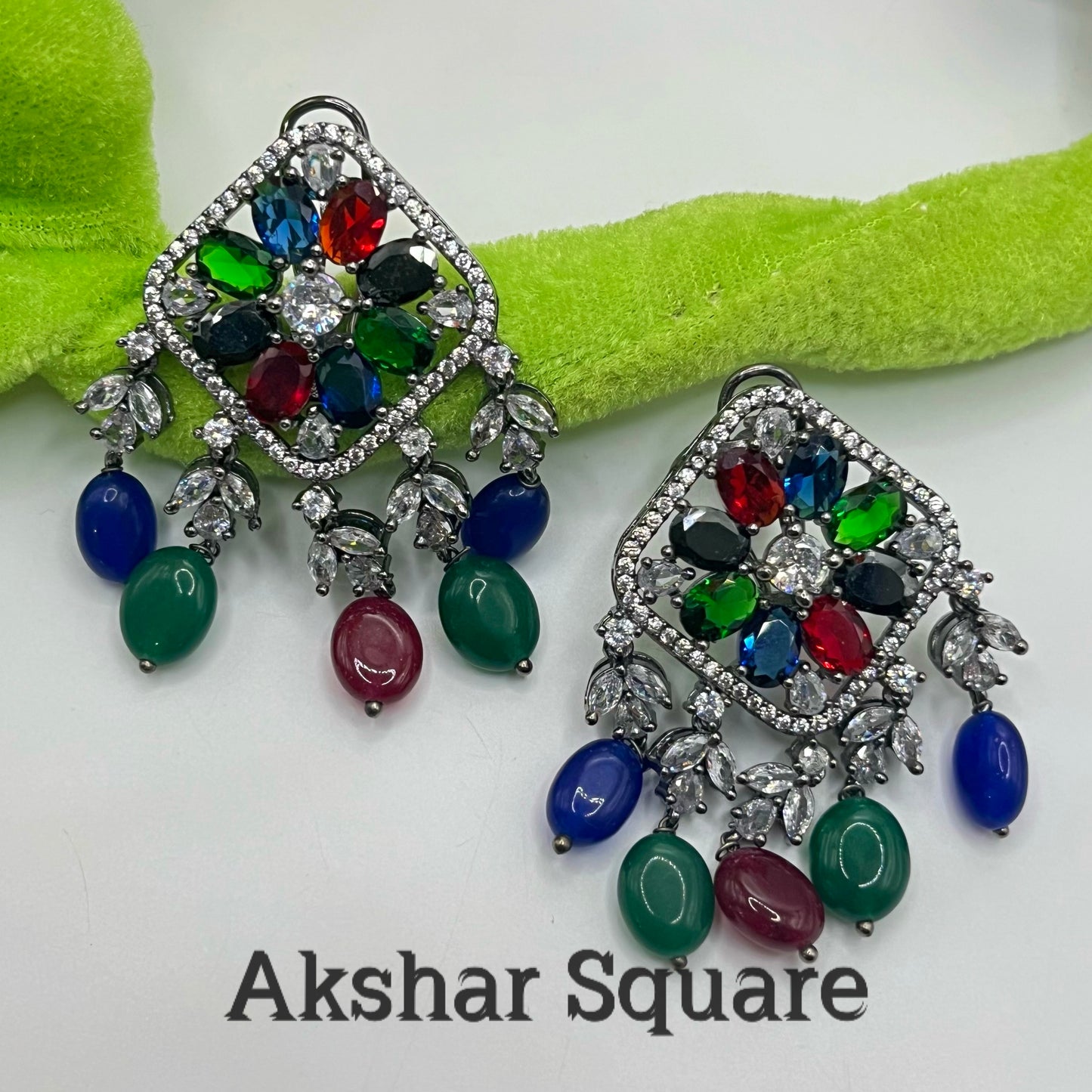 Victorian finish CZ(Cubic Zirconia) stone earrings with beads danglers. Comes with back clip and back screw for comfortable wear. Perfect partywear collection.