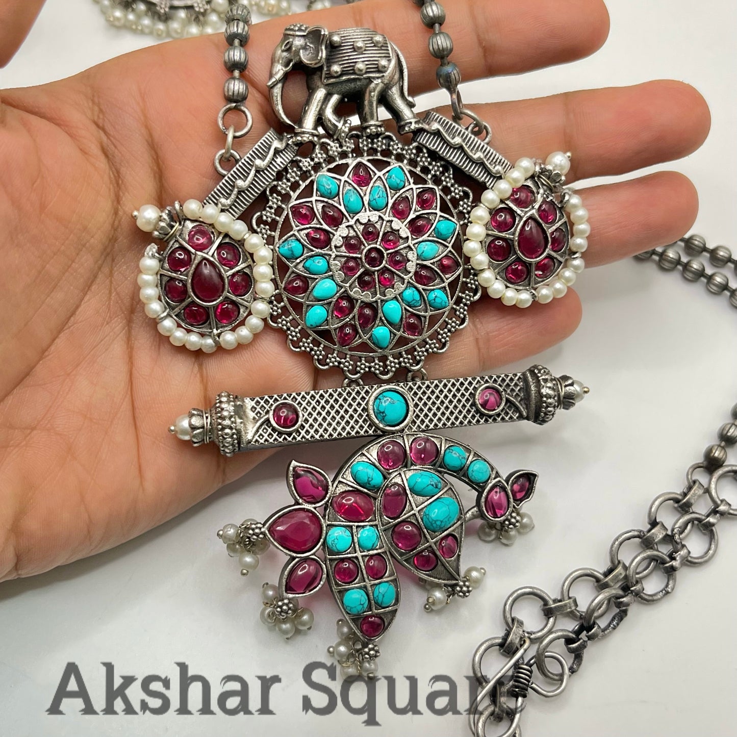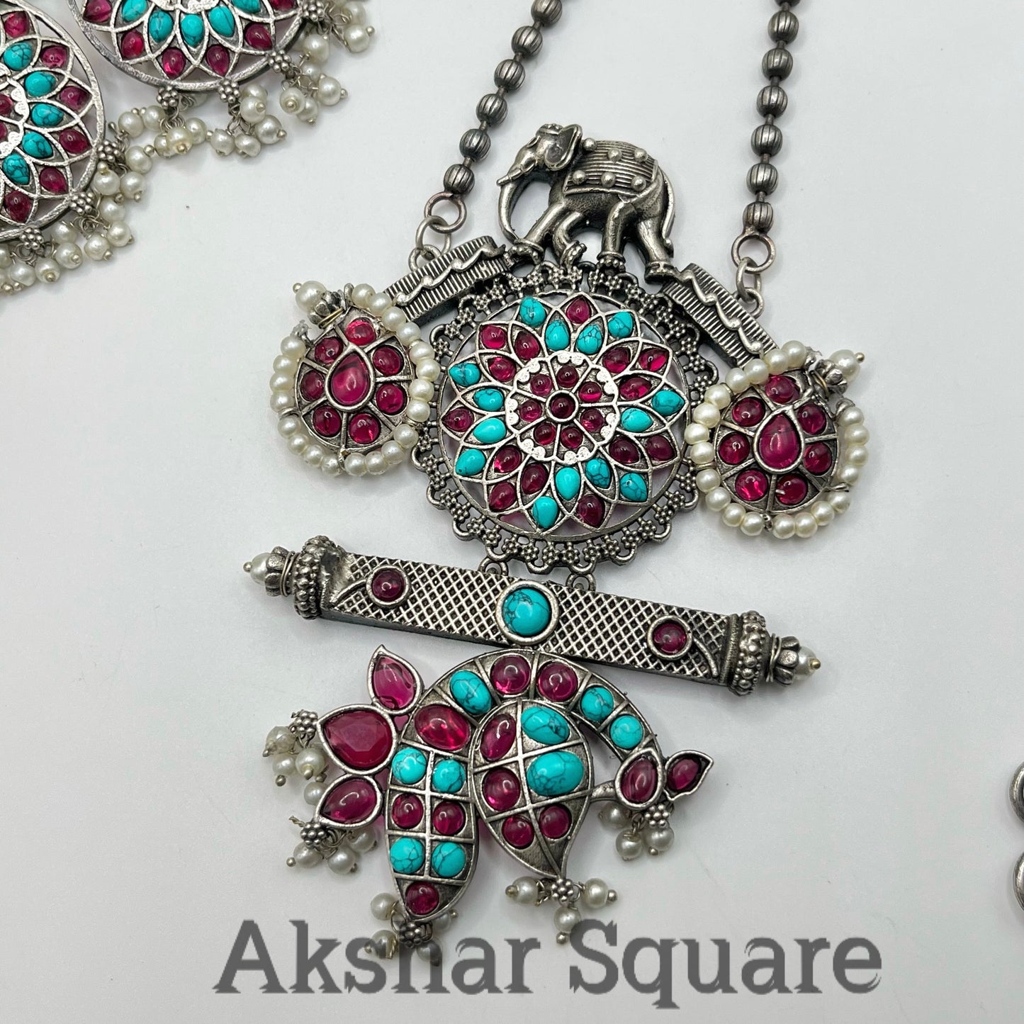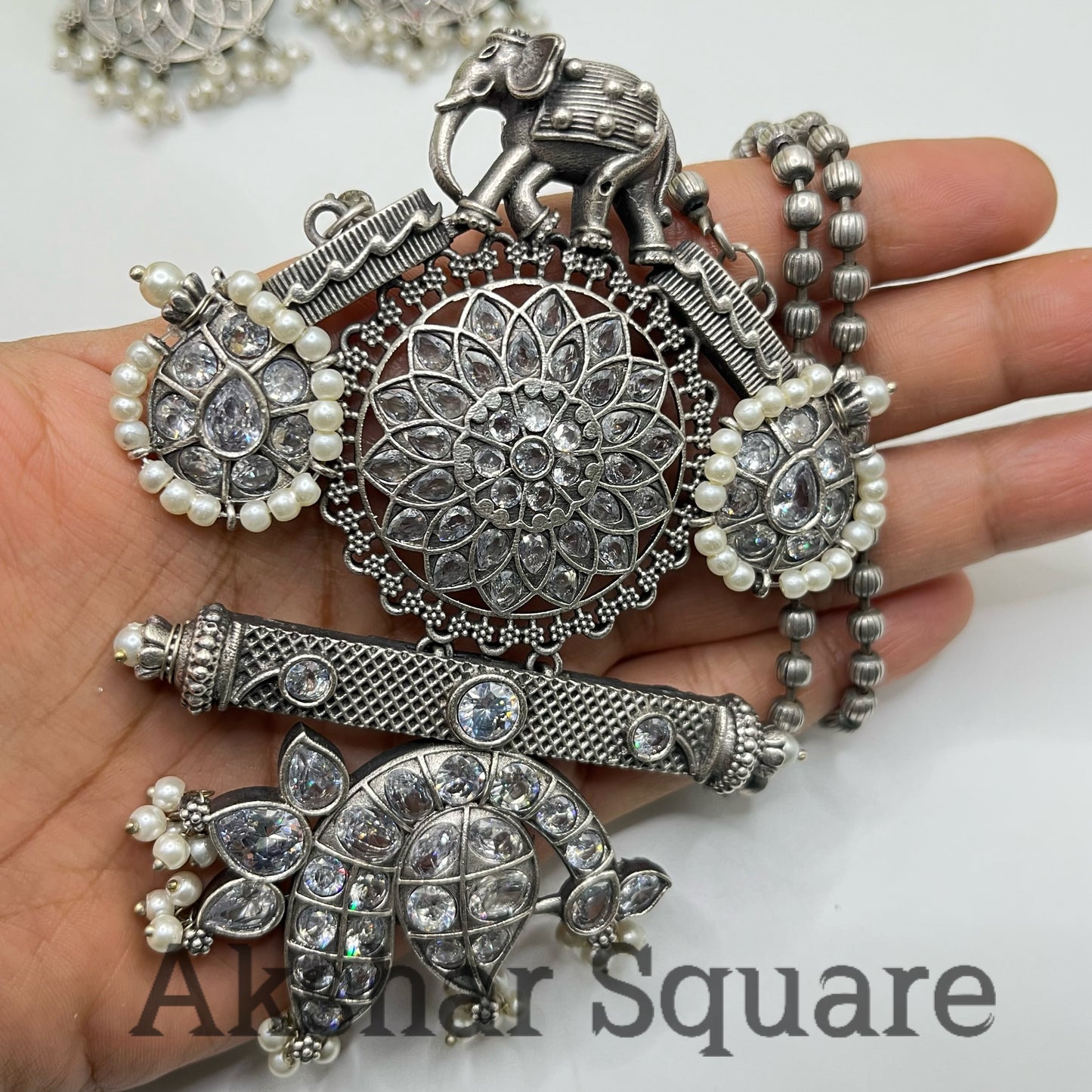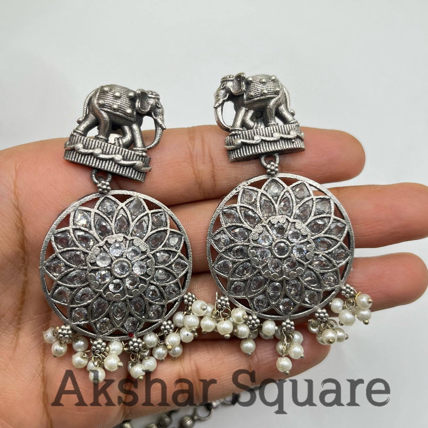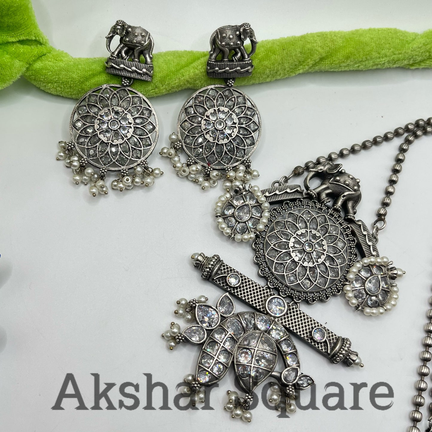 Beautiful German Silver long chain mala necklace featuring elephant design pendent, kemp stone , CZ stone with cluster pearl hangings. Comes with matching elephant design earrings.