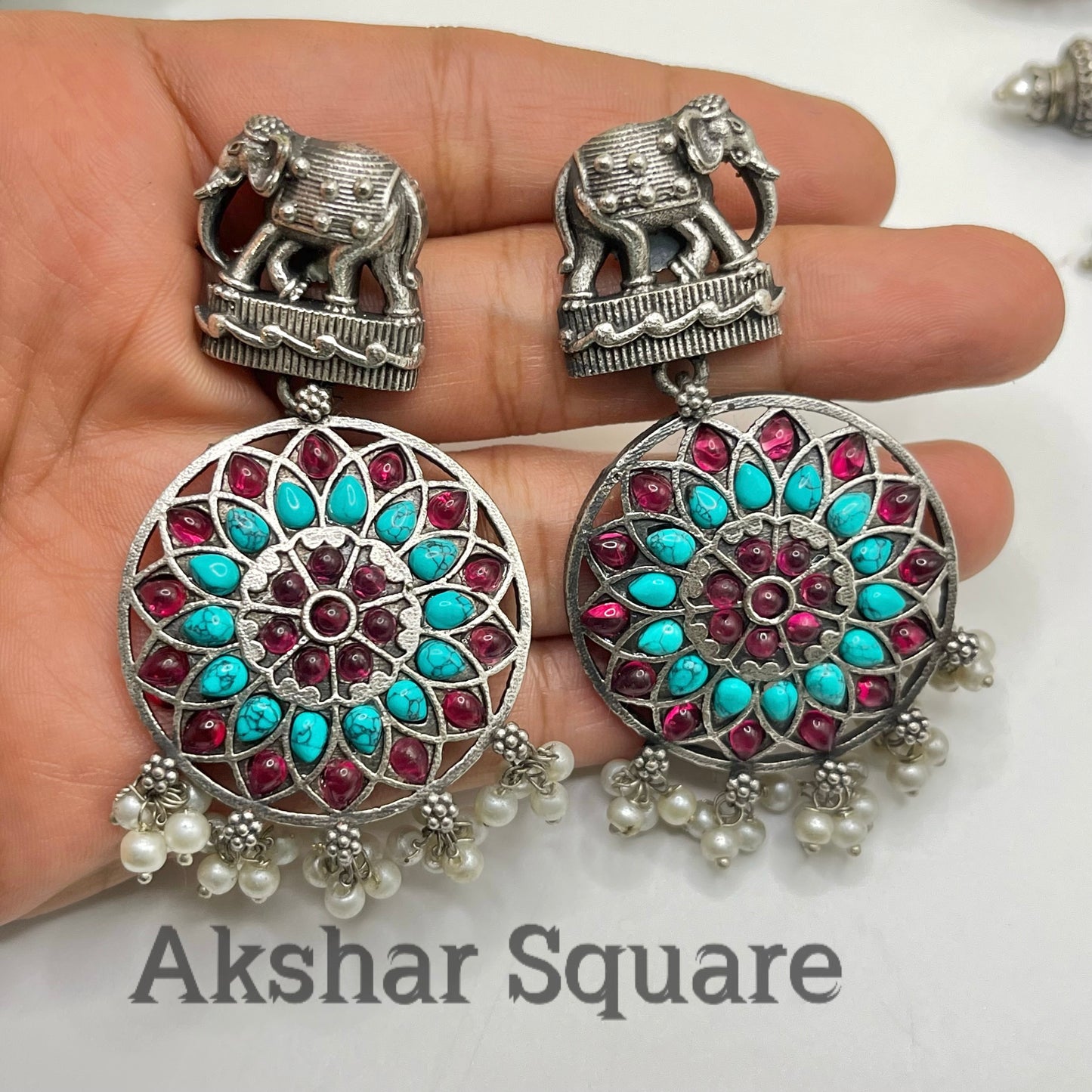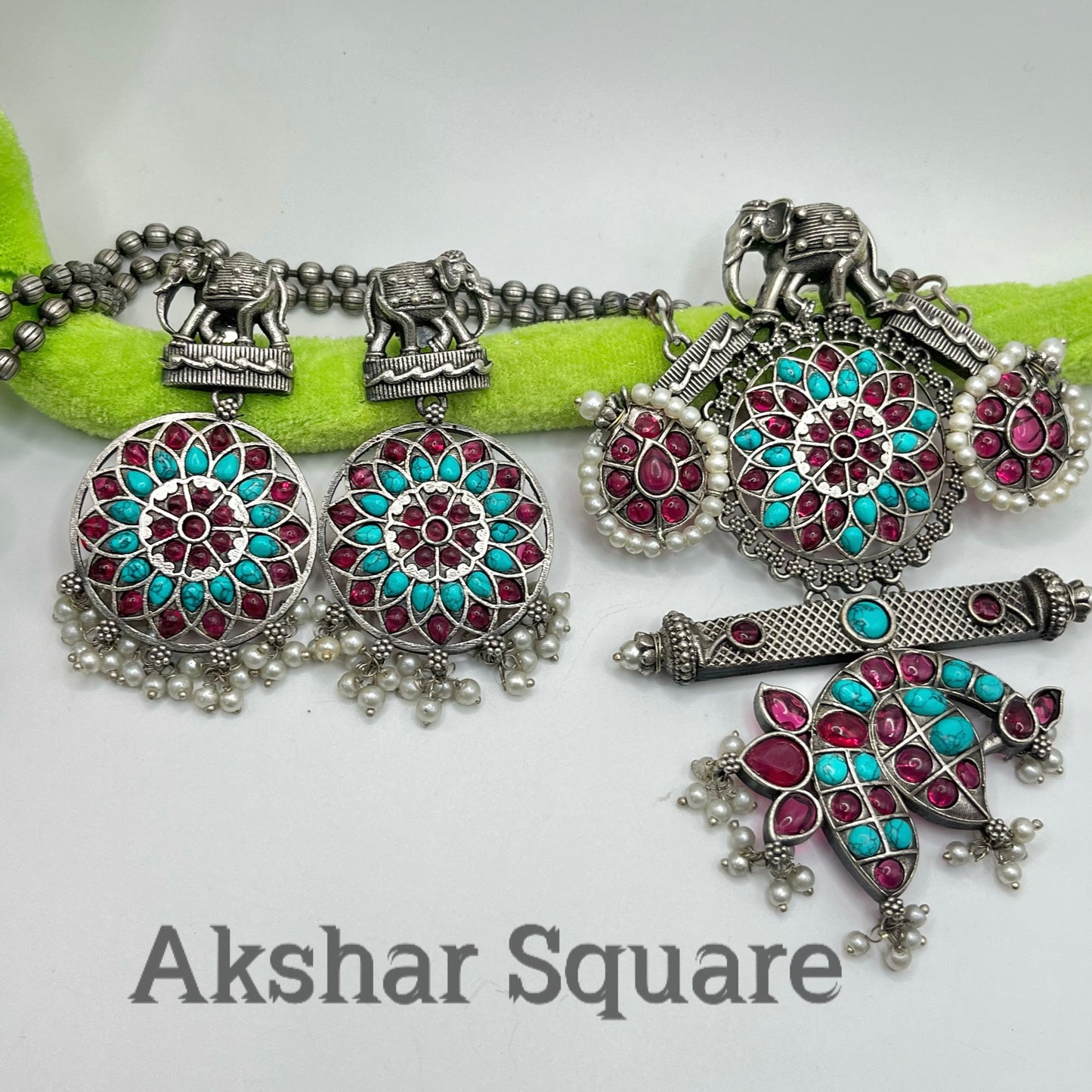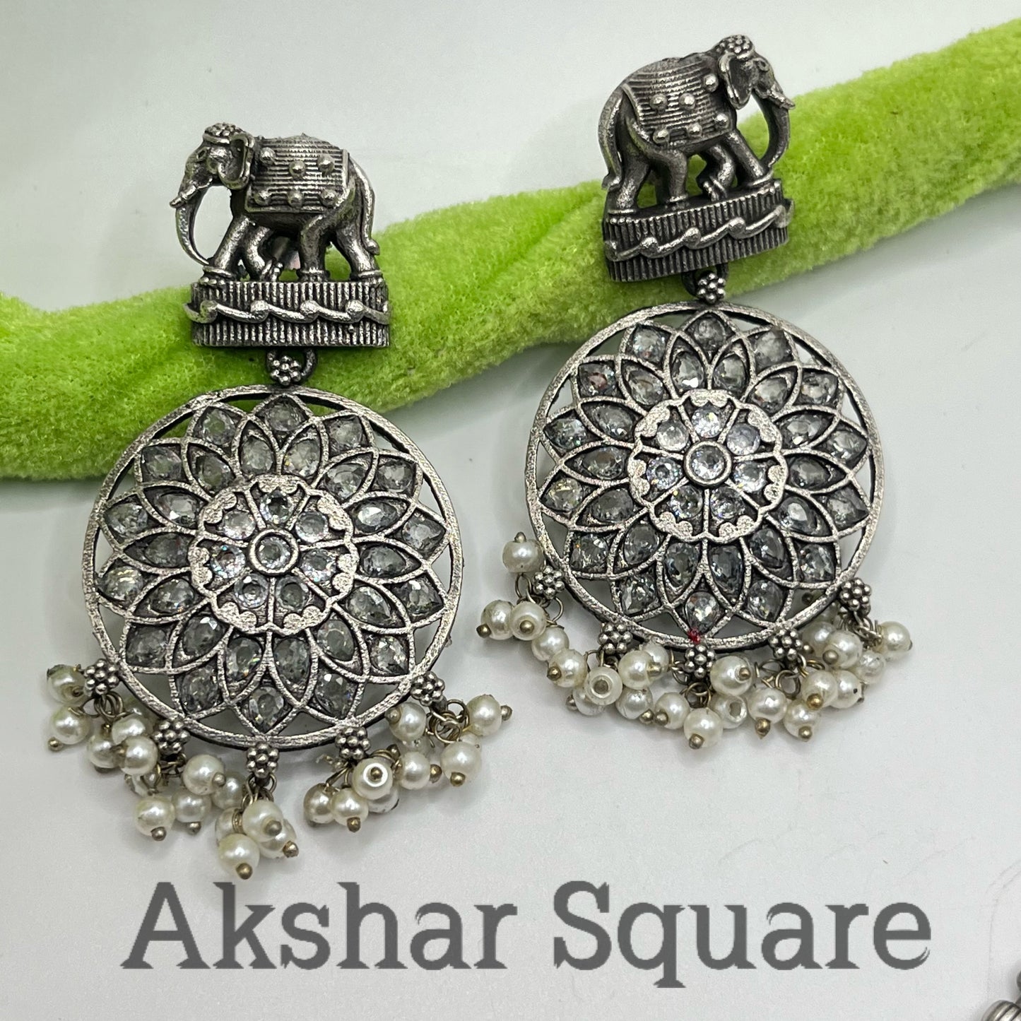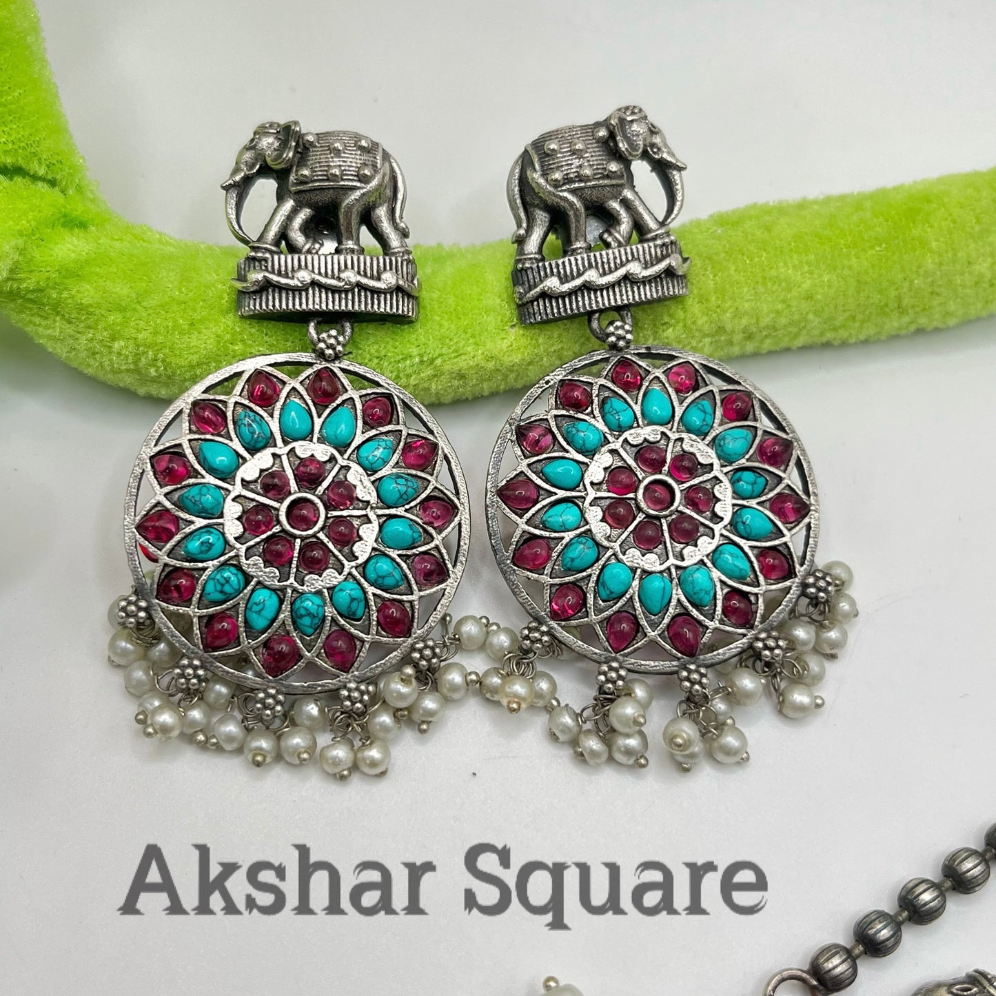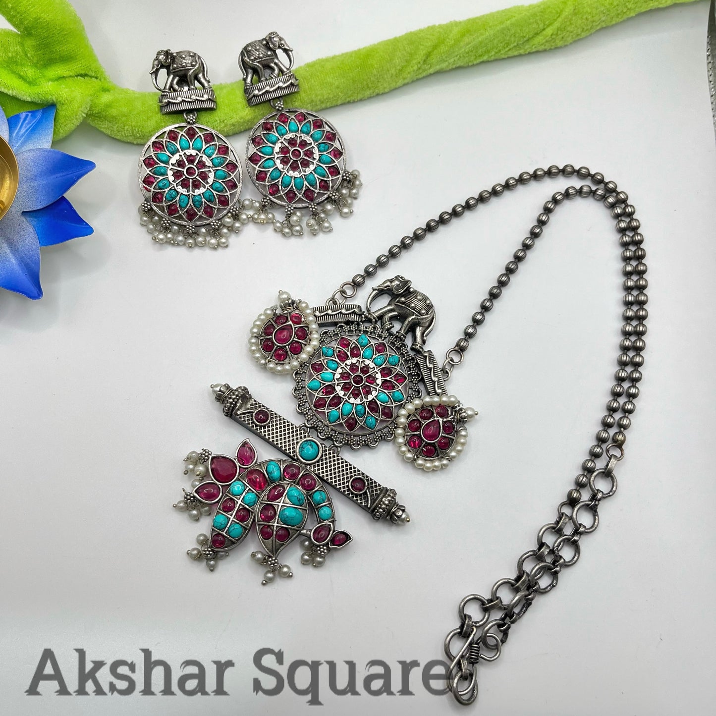 Beautiful German Silver long chain mala necklace featuring elephant design pendent, kemp stone , CZ stone with cluster pearl hangings. Comes with matching elephant design earrings.