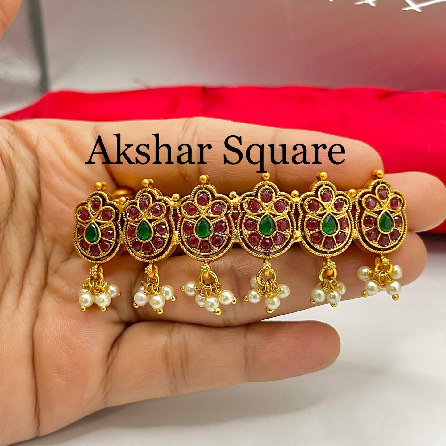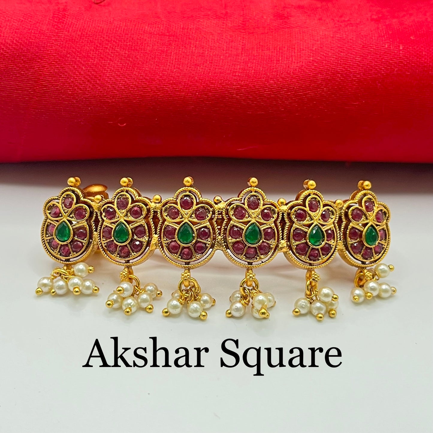 Beautiful peacock design hair clip with AD stones & pearl hanging in a premium quality gold finish.