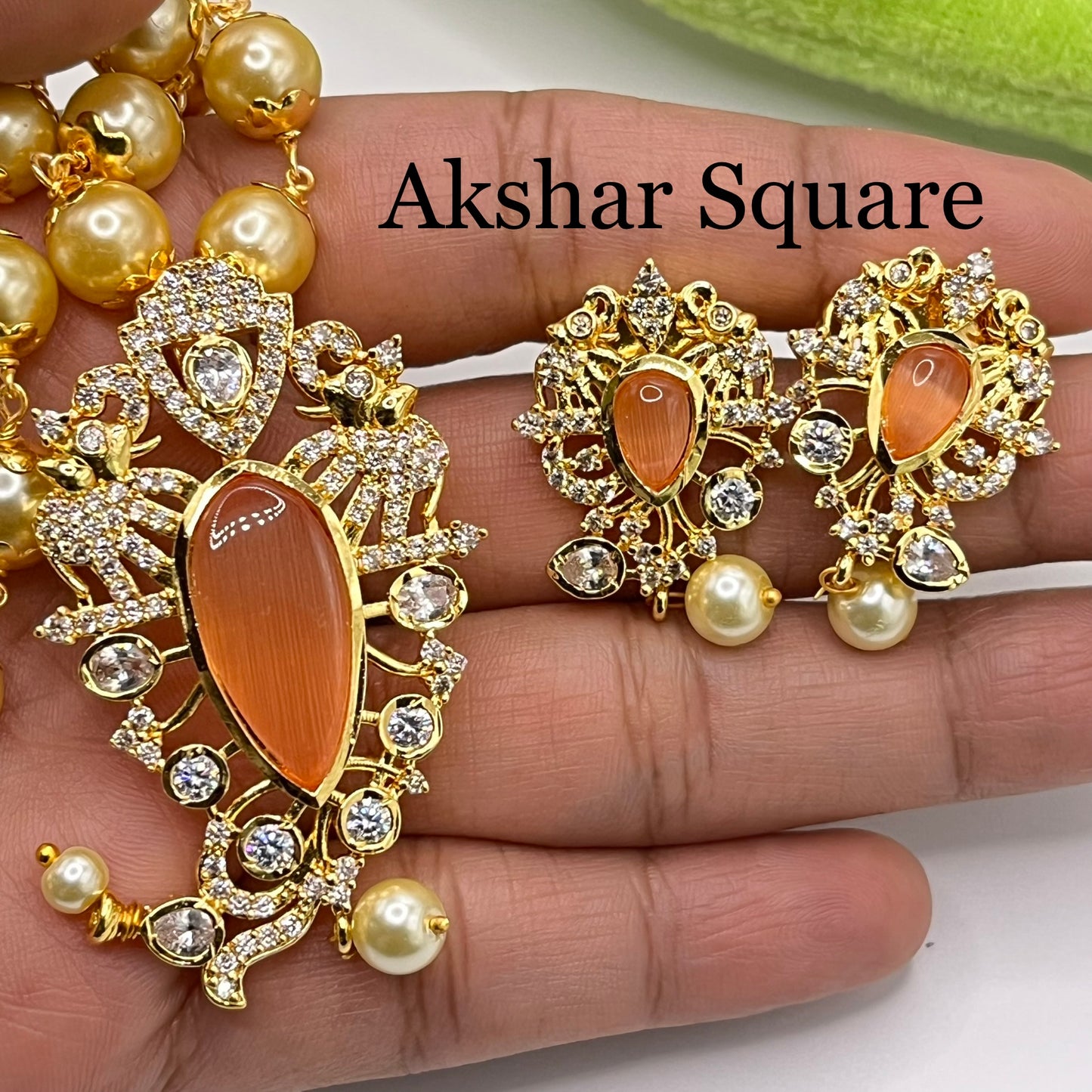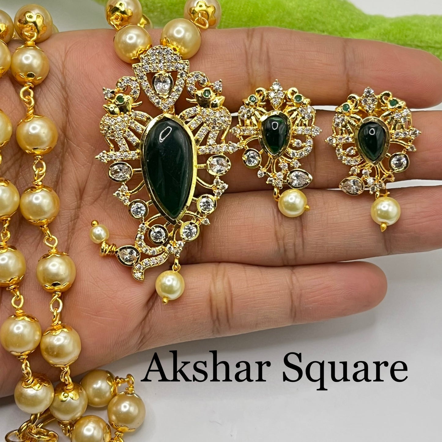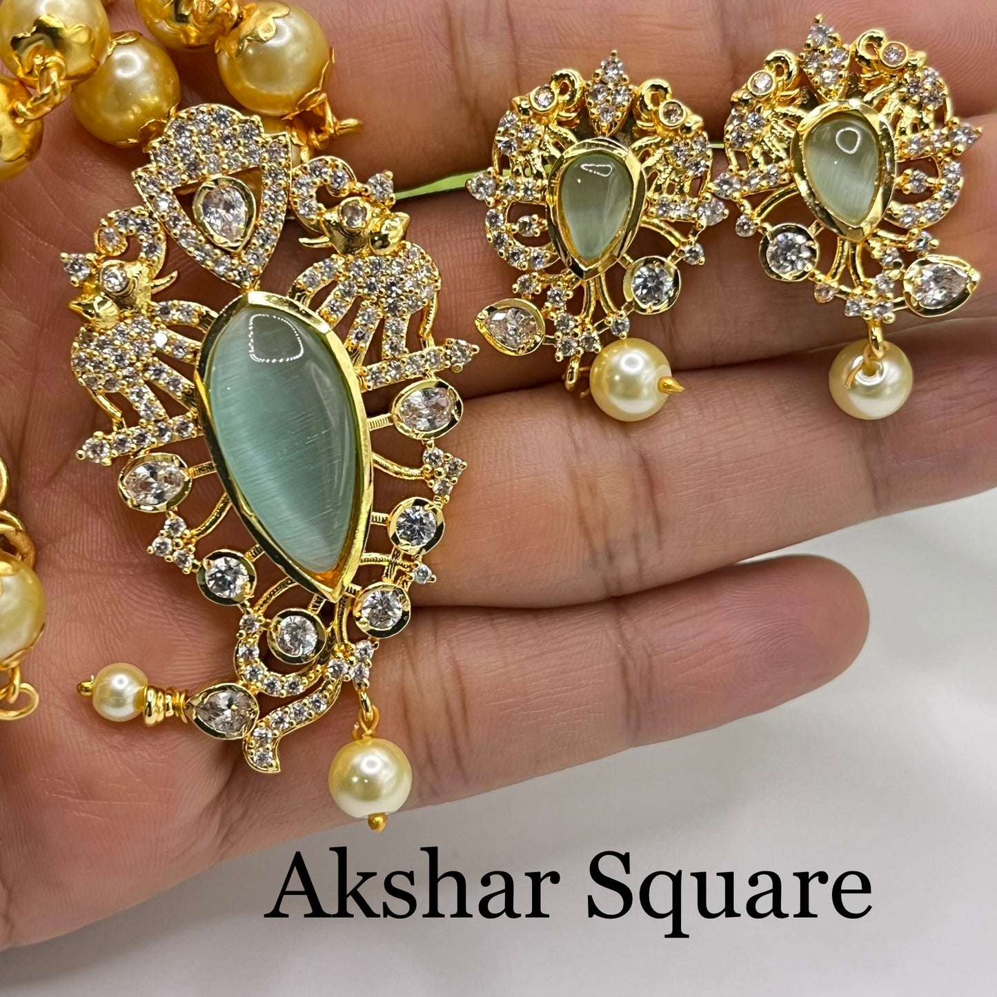 High quality gold finish pearl mala pendant set with AD stones and tear drop shaped monalisa center stone. Beautiful elephant design pendent studded with AD stones and is removable from the pearl mala. You can dress up with plain pearl mala too.