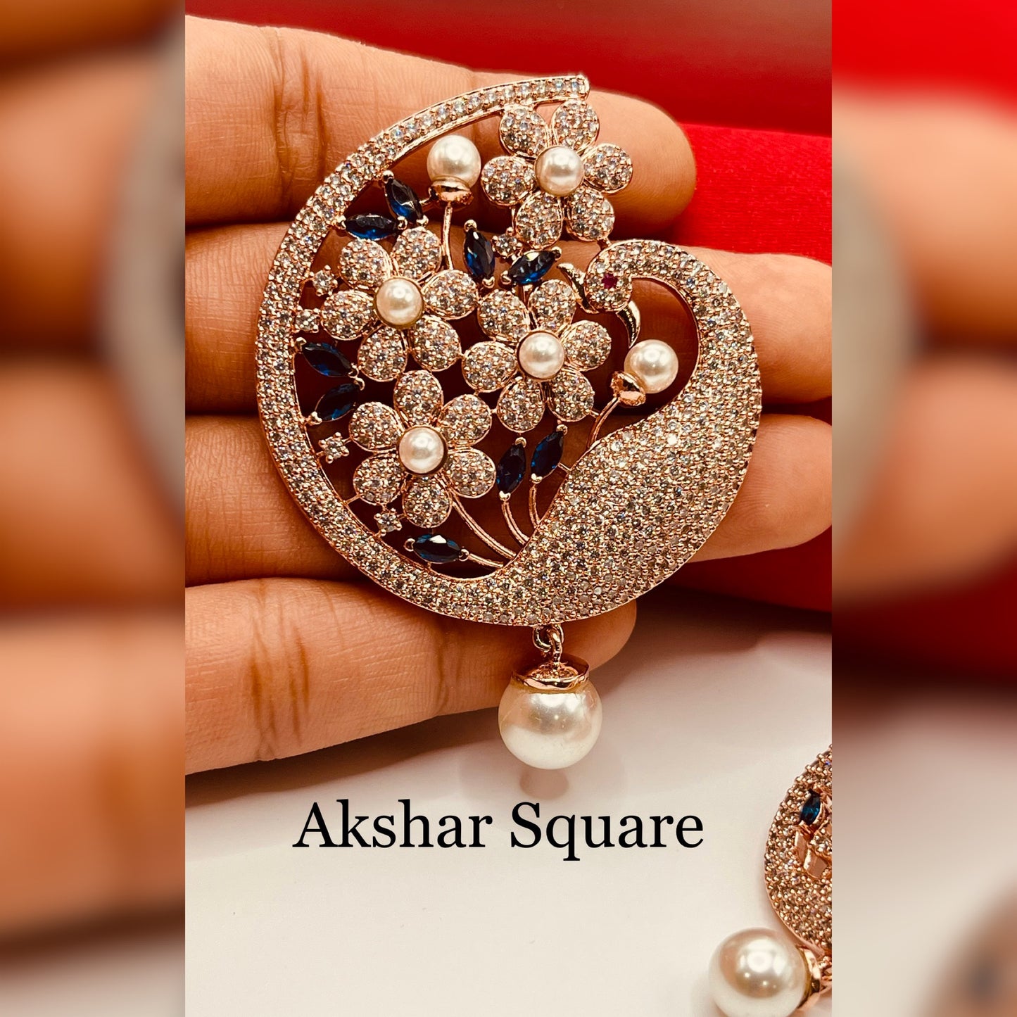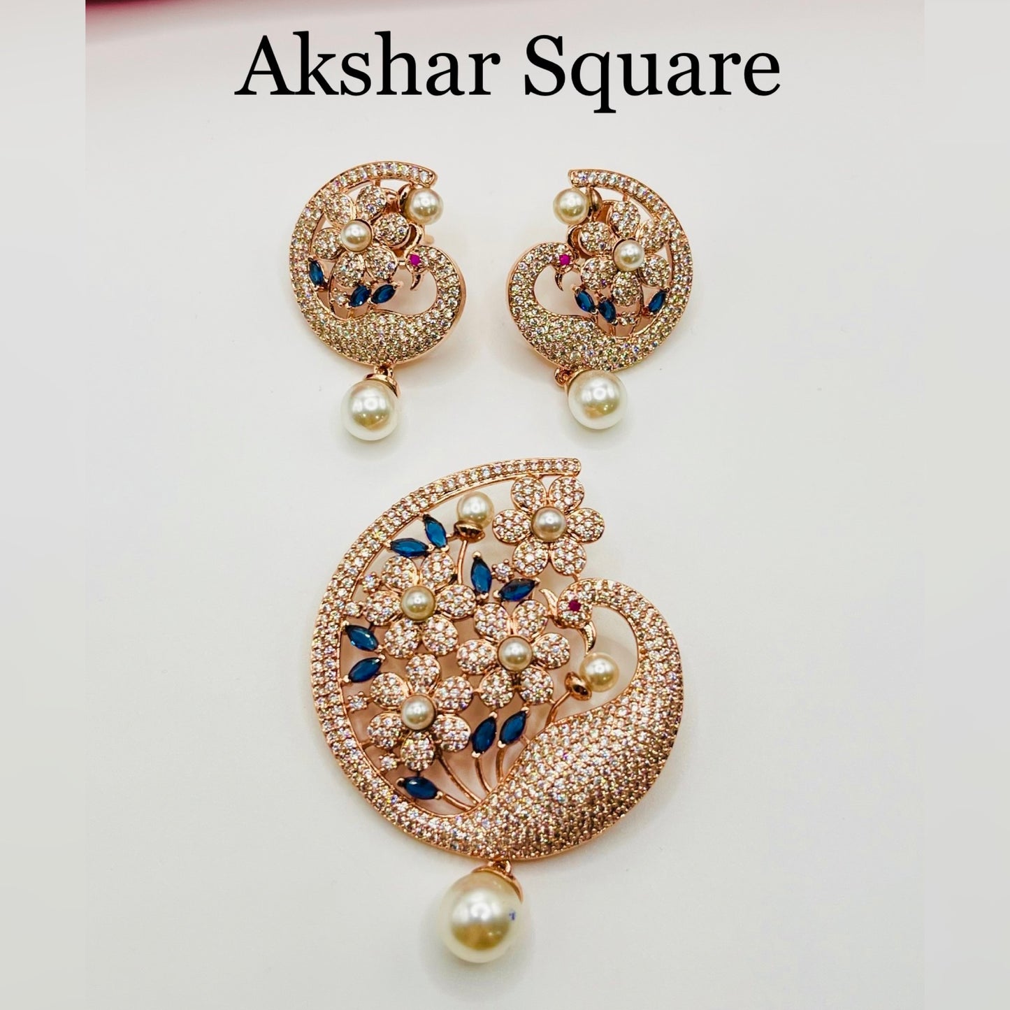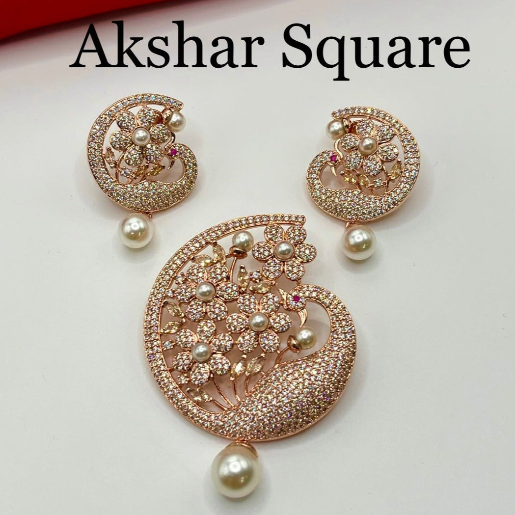 Premium quality rosegold finish peacock pendant set with CZ stones & pearls. Combo includes pendant & stud earrings.